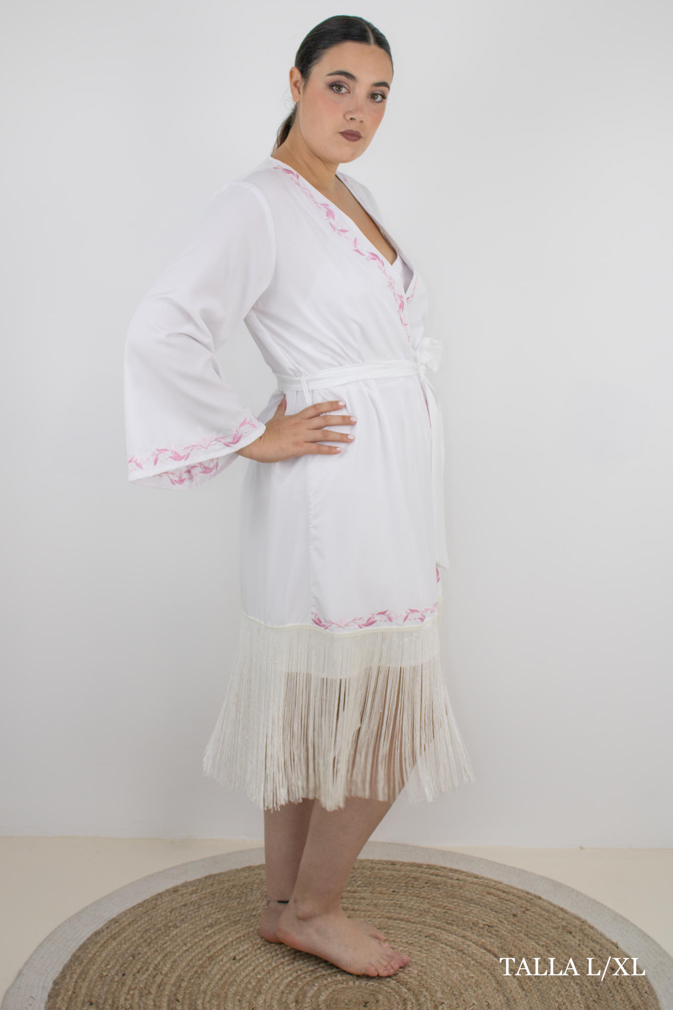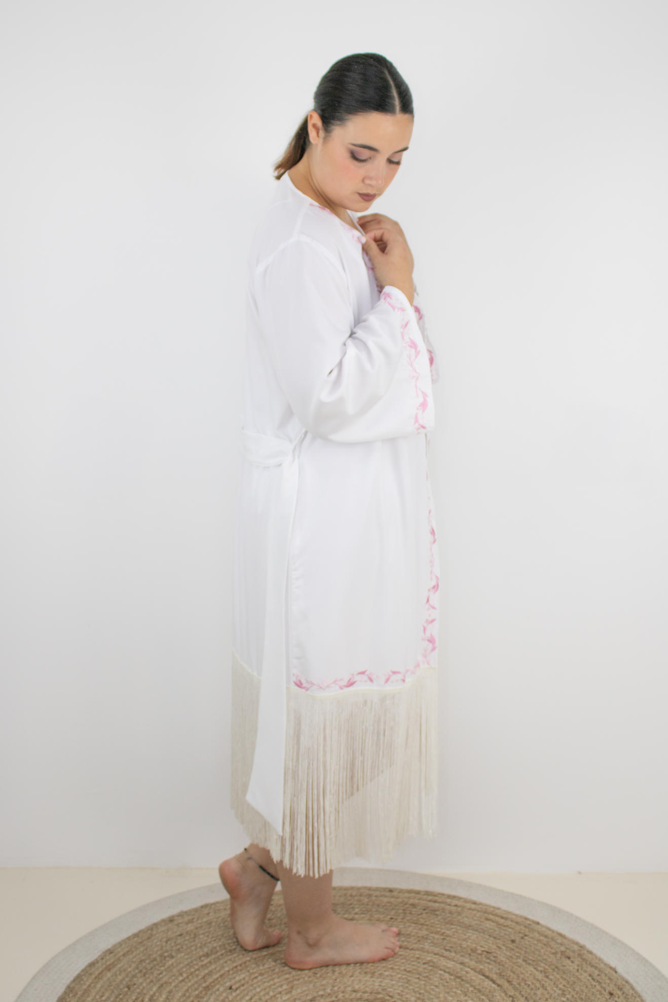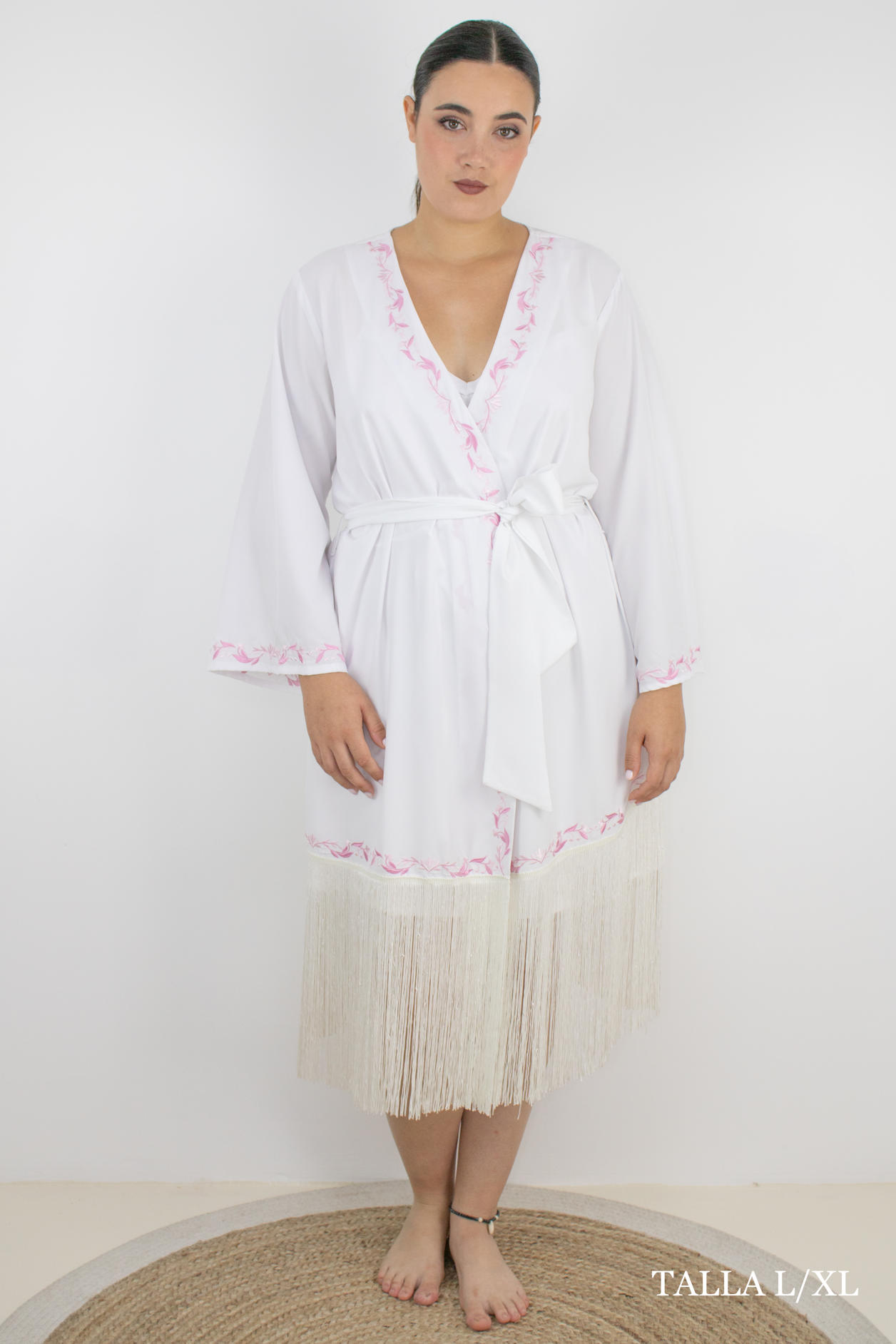 La Bata Flecos de estilo kimono, tiene mangas anchas y acabado en el bajo con flecos largos, dándole un estilo espectacular a esta bata. Es de color Blanco y está decorado con un bordado en el delantero y mangas en tonos rosa.