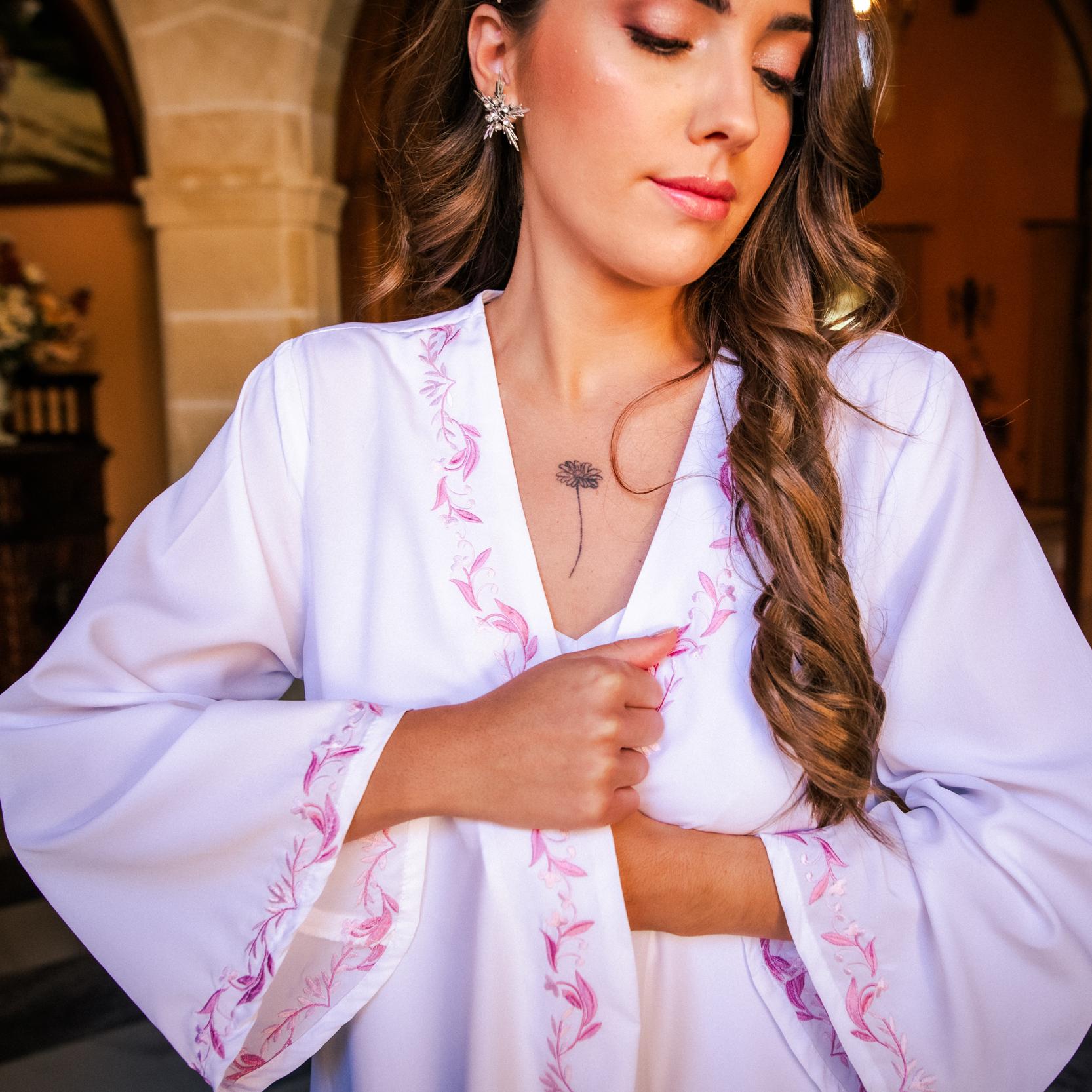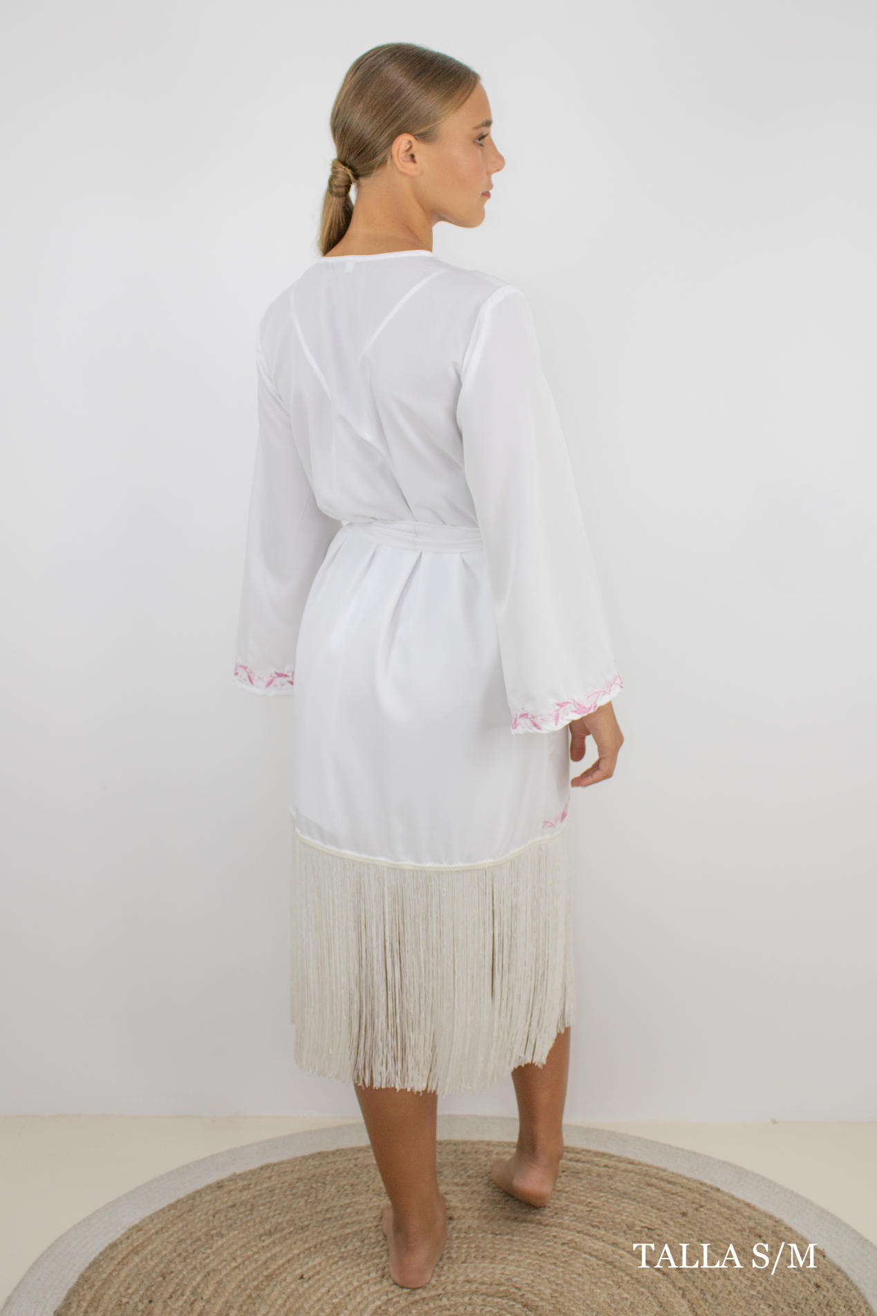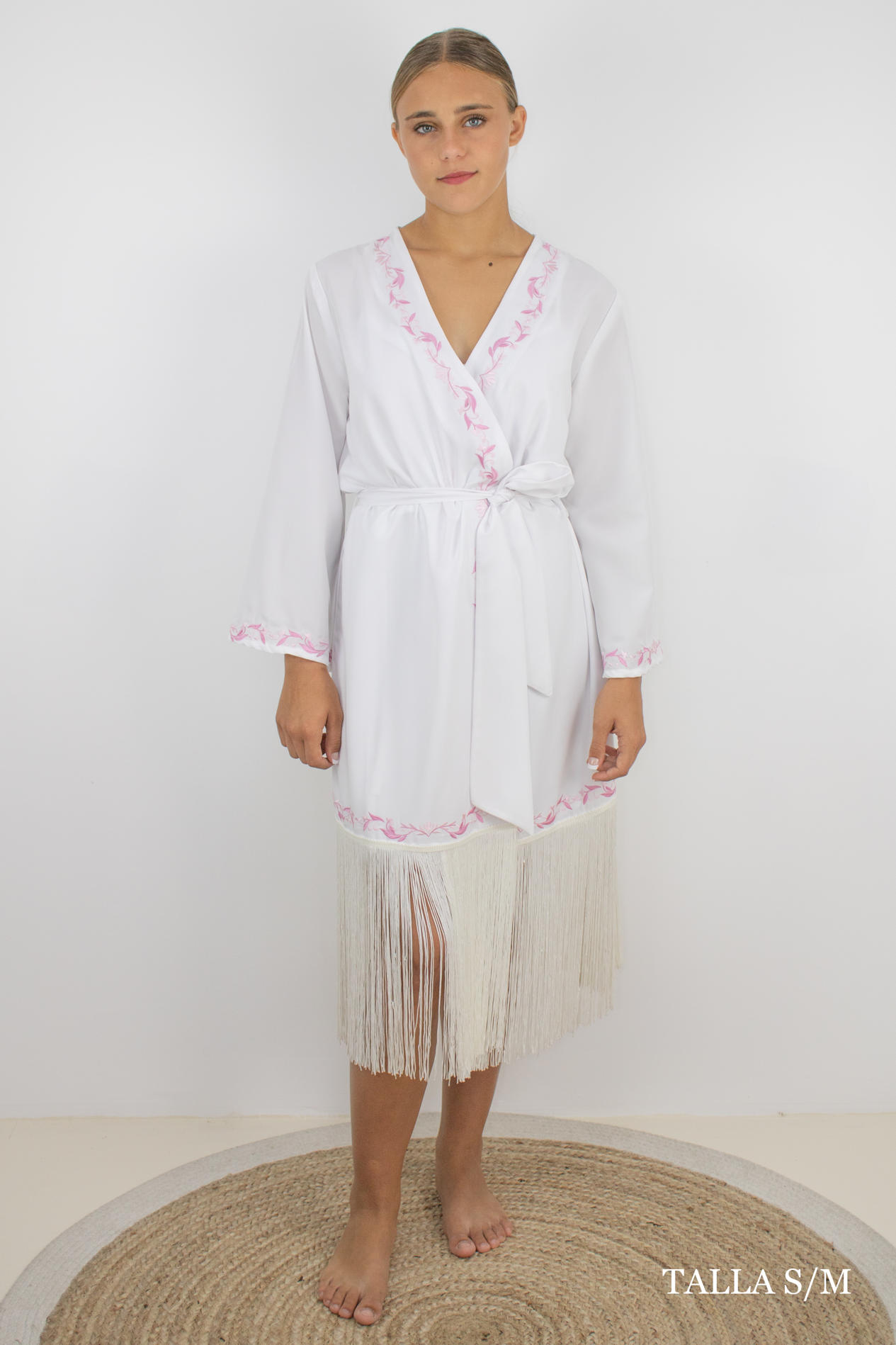 La Bata Flecos de estilo kimono, tiene mangas anchas y acabado en el bajo con flecos largos, dándole un estilo espectacular a esta bata. Es de color Blanco y está decorado con un bordado en el delantero y mangas en tonos rosa.